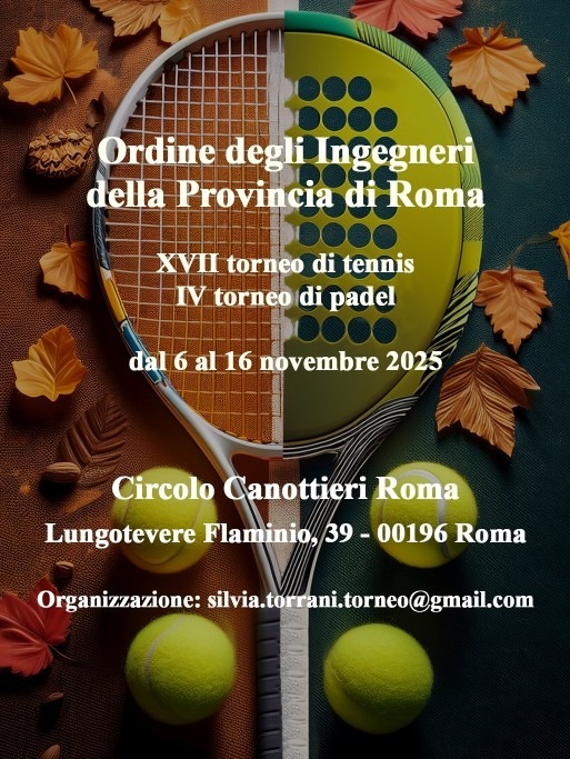 Siamo arrivati alla Diciassettesima edizione del Torneo di Tennis e alla Quarta edizione del Torneo di Padel dell’Ordine degli Ingegneri della Provincia di Roma, che si giocherà dal 6 al 16 novembre 2025 sui campi del Circolo Canottieri Roma, in Lungotevere Flaminio 39, a Roma.